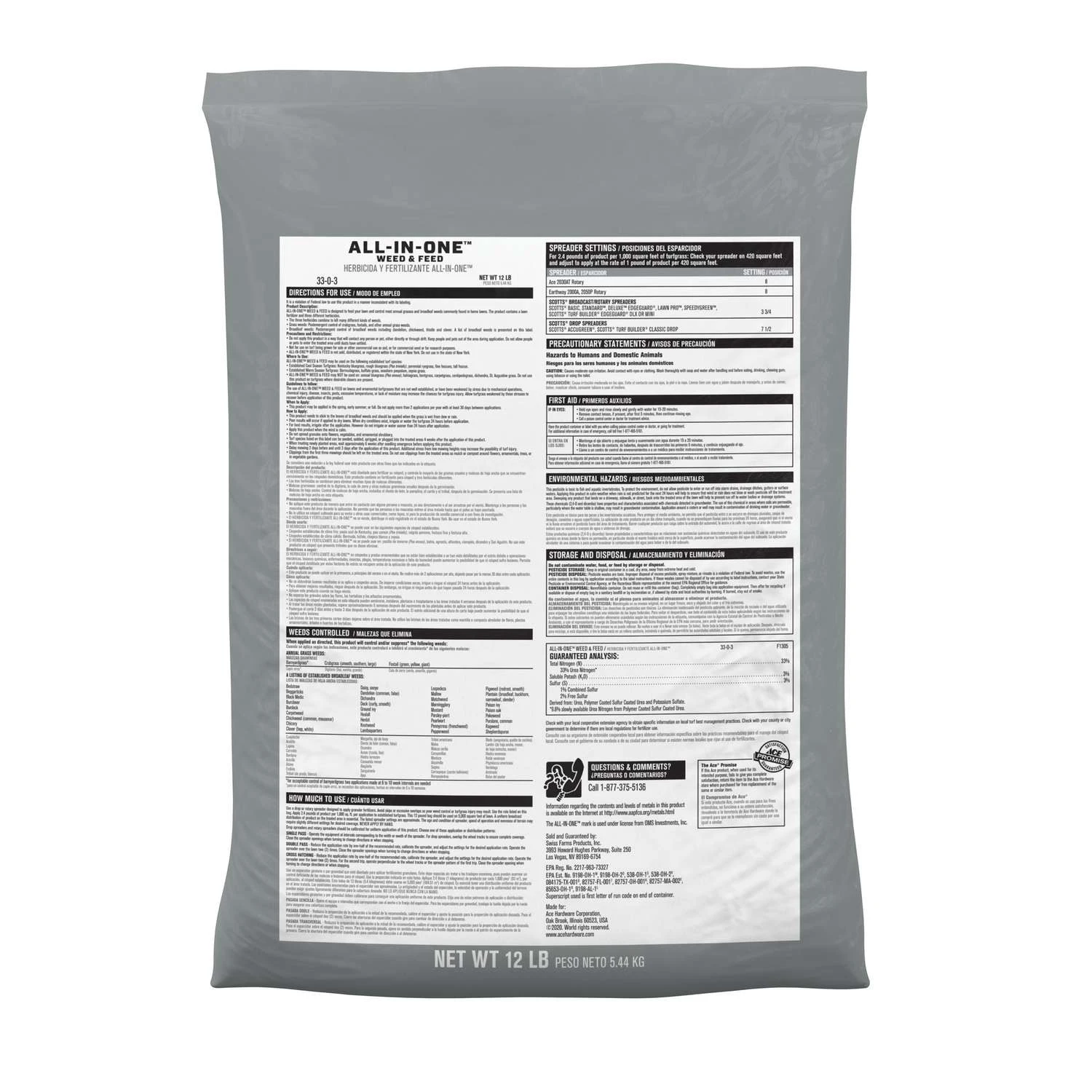 Ace All-In-One Weed & Feed has been formulated with a lawn fertilizer and three different herbicides to feed your lawn and kill crabgrass and broadleaf weeds. Apply Ace All-In-One Weed & Feed with a rotary or drop spreader in the spring, early summer, or fall. May be used on Bermudagrass, Kentucky Bluegrass, Rough Bluegrass, Perennial Ryegrass, Tall Fescue and Fine Fescue, Buffalo Grass, Seashore Paspalum, and Zoysia grass. It controls crabgrass, dandelion, clover, chickweed, and other broadleaf and grass weeds (as listed). It provides extended feeding and promotes root growth for a thicker, greener lawn. Kill broadleaf weeds and crabgrass, while fertilizing your lawn, with Ace All-In-One Weed & Feed. Ace All-In-One Weed & Feed kills crabgrass and broadleaf weeds (including dandelion, clover, and chickweed) and fertilizes your lawn all in one easy step For use on Bermudagrass, Kentucky Bluegrass, Perennial Ryegrass, Tall Fescue and Fine Fescue, and Zoysia grass Lawn fertilizer provides quick greening and extending feeding, and promotes root growth for a thicker, greener lawn Use a rotary or drop spreader to apply this grass fertilizer in the spring, early summer, or fall Covers 5,000 sq. ft.