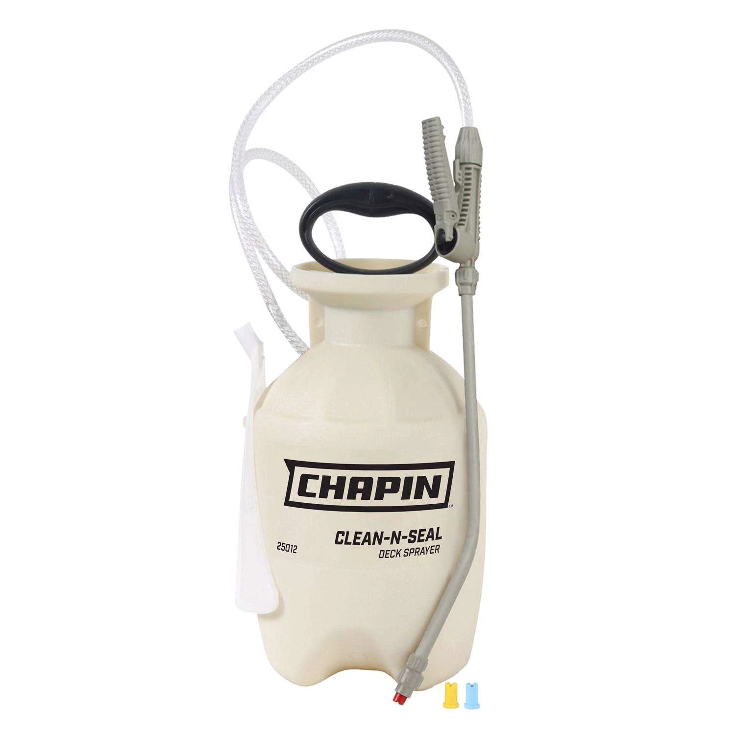 The Chapin 250121-gallon Clean ‘N Seal Poly Deck Sprayer has a funnel top and translucent tank for easy filling and cleaning. It’s compatible with deck cleaners, sealers and transparent stains. This sprayer comes with three poly fan nozzles for fine, medium and coarse spray pattern and a total control spray shield to protect your siding. Its ergonomic handle allows for easy pumping and carrying. 1-Gallon funnel-top, translucent tank for easy filling and cleaning Compatible with deck cleaners, sealers and transparent stains 3 poly fan nozzles for fine, medium and coarse spray pattern Total Control Spray Shield to protect siding