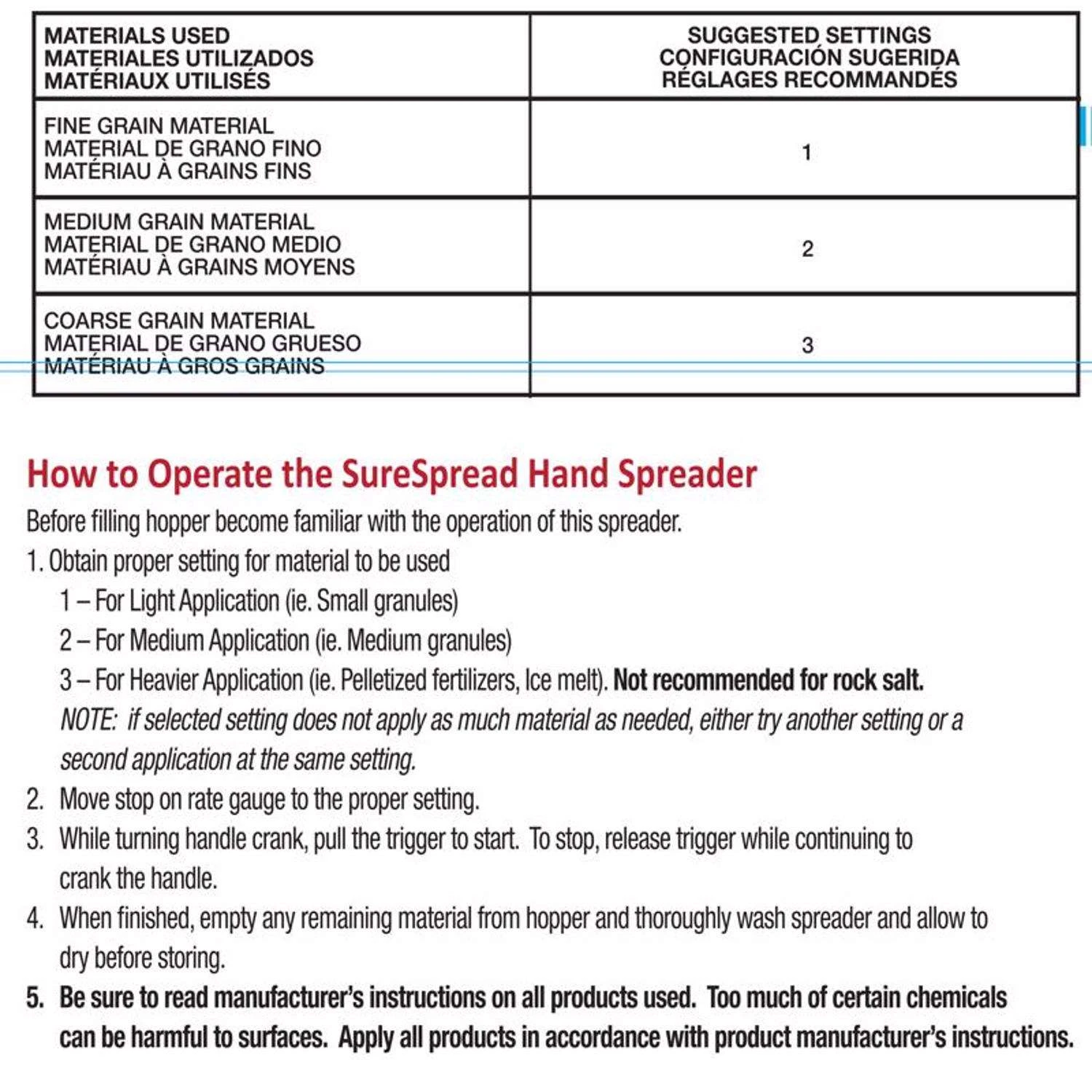 | Spreader Use | Fertilizer/Ice Melt/Seed |