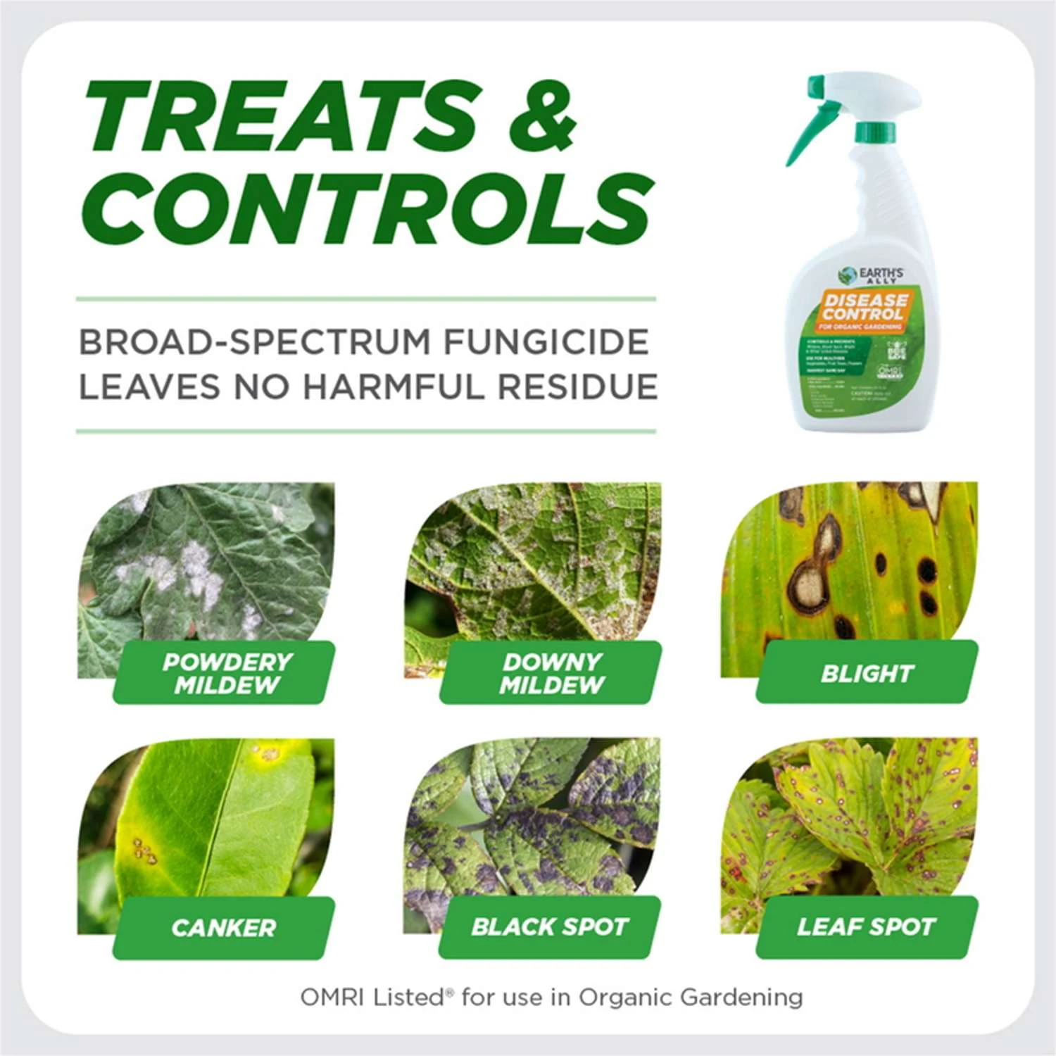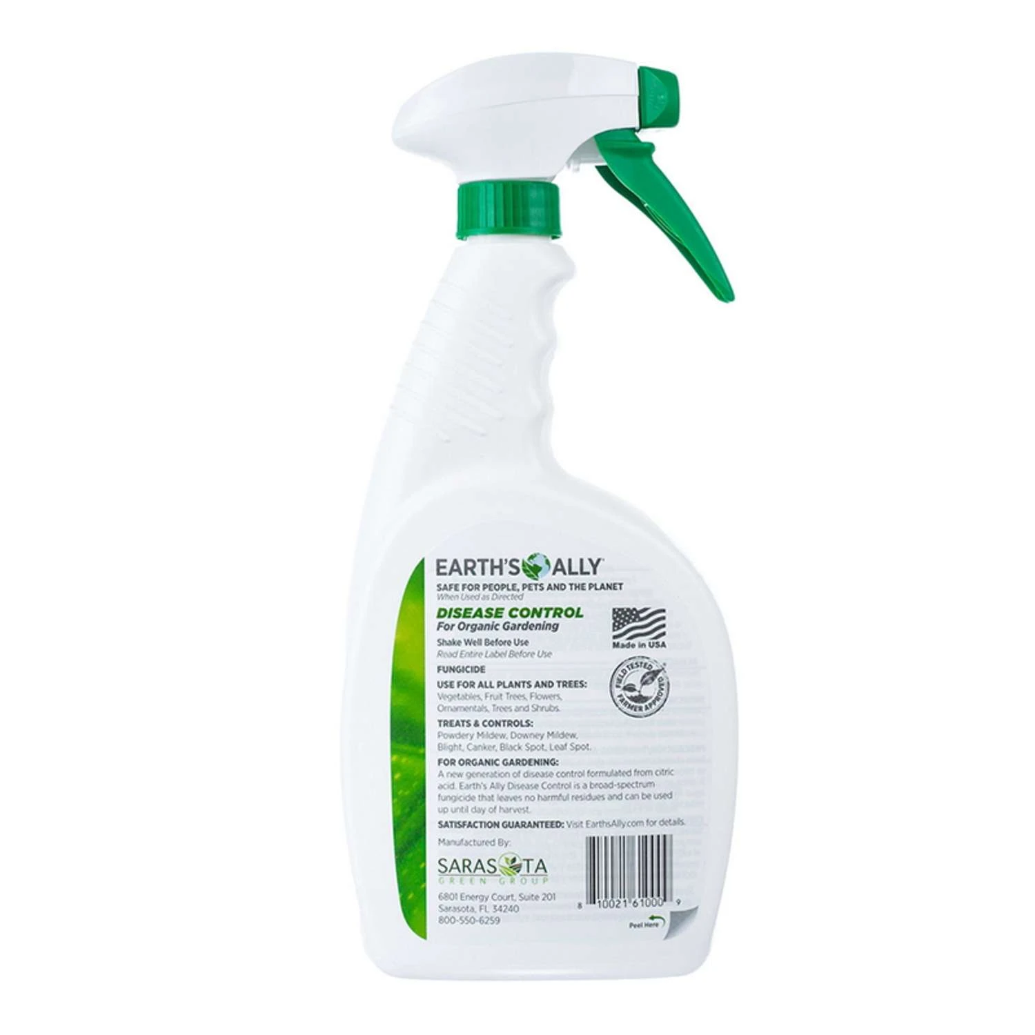 A new generation of disease control formulated from citric acid, earth’s ally disease control is a broad-spectrum fungicide that leaves no harmful residues and can be used up until day of harvest. Use for all plants and trees: vegetables, fruits, flowers ornamentals, trees and shrubs. Treats and controls powdery mildew, downy mildew, blight, canker, black spot and leaf spot. Natural fungicide for vegetables, fruits, ornamentals and houseplants Safe for people, pets and planet Cures and prevents common plant diseases Can be used indoors or outdoors OMRI listed for use in organic gardening Bottled specifically for the home gardener and small organic farmer Scrutinized and tested by independent laboratories to ensure their safety and effectiveness