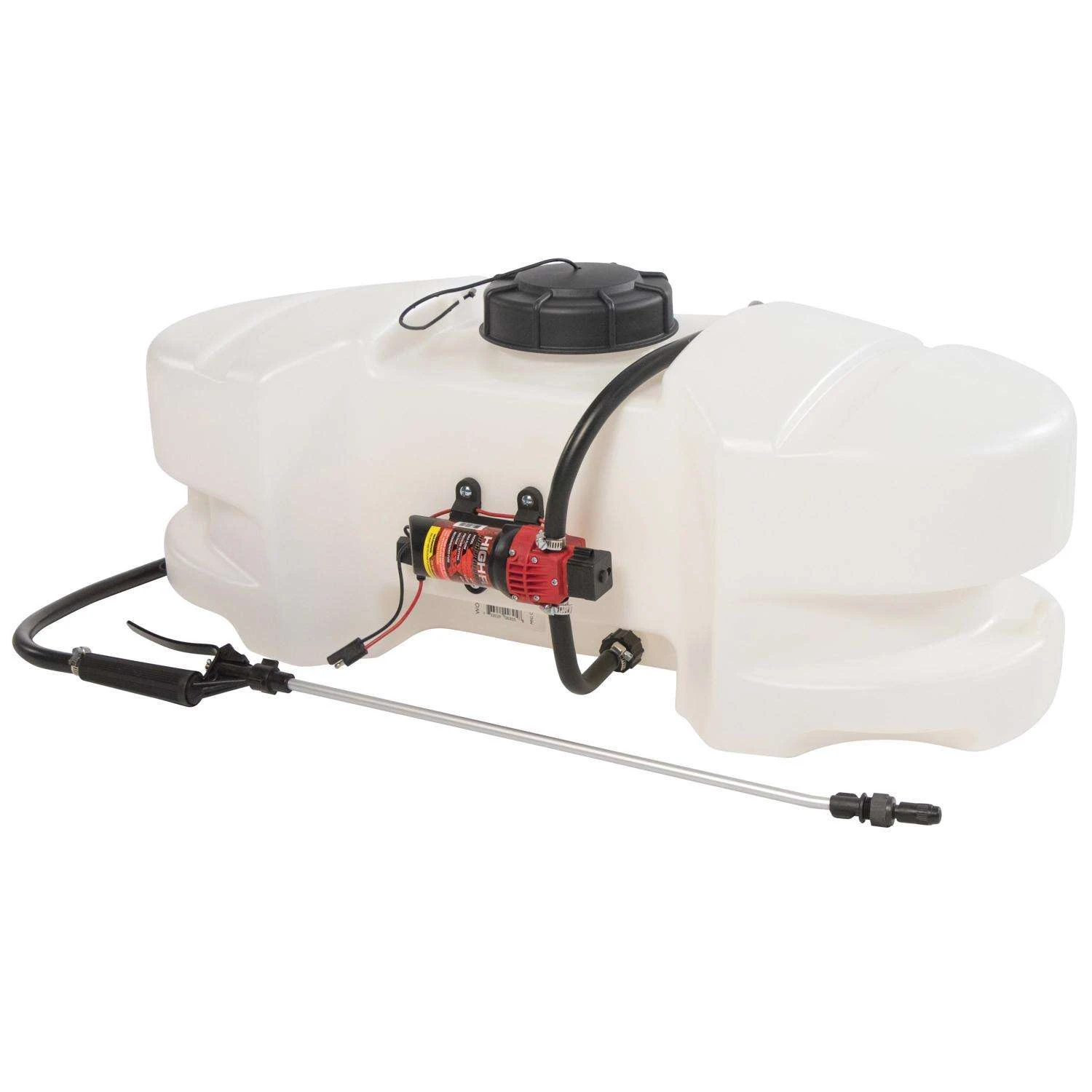 15 Gallon spot sprayer with 1.2 gpm pump and economy handgun Lower tank profile for improved stability Full drain out capability with molded-in drain port, cap and tether Lever handgun Molded wand clips Roundup ready