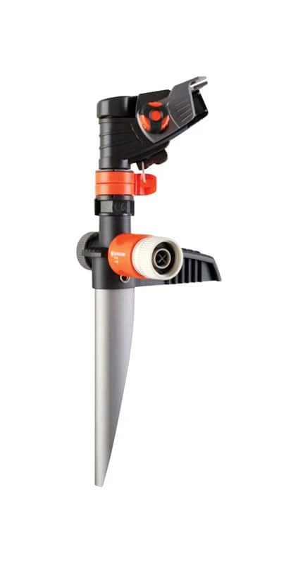 GARDENA pulse sprinkler on METAL spike, full or part circle with easy to adjust tabs, spray height easily adjustable with orange knob with rubber inserts for slip resistant grip, Made in Germany ! Corrosion resistant METAL step spike designed to pearce soil easily Easily adjustable watering range Can be connected in-line with additional Gardena Spike Sprinklers