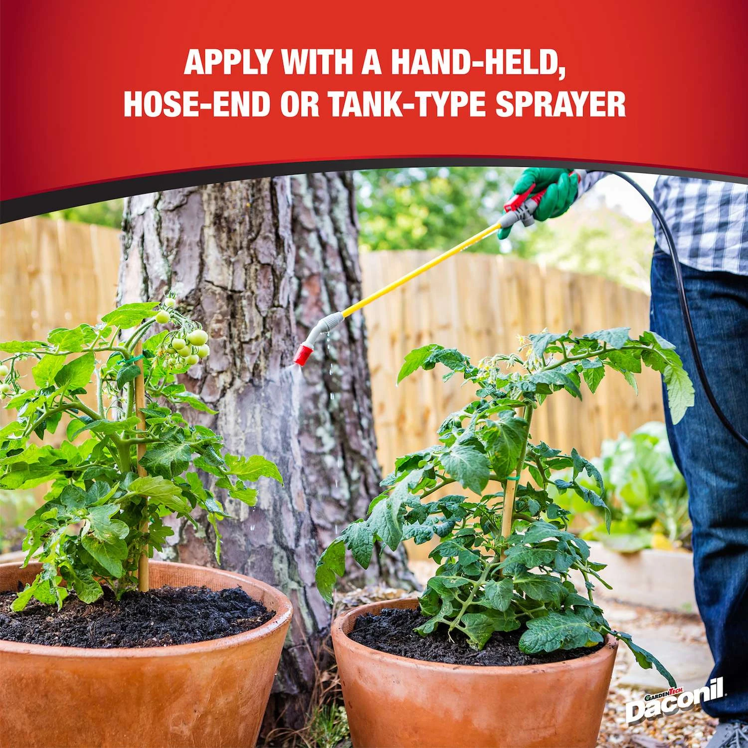 When fungal diseases kick inch, they wreak garden havoc on everything from prized vegetables to favorite shrubs. Daconil Fungicide Concentrate and its easy-to-use measuring cap make effective treatment simple. You can prevent stop or control active fungal diseases on vegetables, fruits, roses, flowers, shrubs ornamental trees and conifers. It’s rain-proof protection you can trust. 3-Way Control: Controls/Stops and Prevents over 75 Diseases including Tomato Blight, Anthracnose, Fusarium Wilt, Mold, Powdery Mildew and more For use on vegetables, flowers, fruit & shade trees Rain-proof protection Concentrated formula is ready to mix with water Concentrated formula can make up to 64-Gal of fungicide Product includes an easy-to-use measuring cap