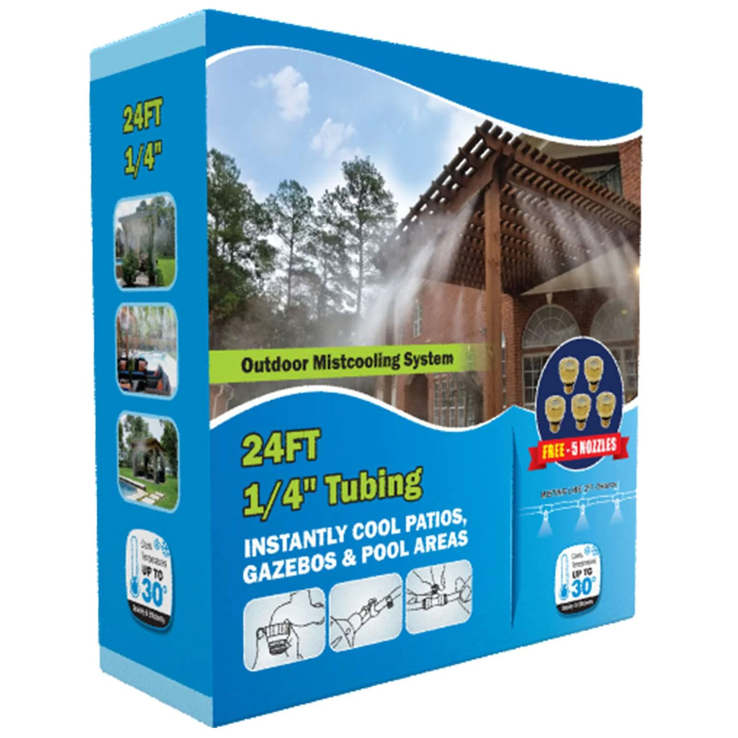 | What's Included | 1x Lead Line 15 ft. Misting Line 9 ft., 4x Brass Nozzle, 1x Slip-Lock Swivel Nut, 5x Mounting Clamps, 3x Tee-fitting with Nozzle Holder, 3x Three Way Pipe Tee Fitting, 1x End Fitting with Nozzle Holder, 1x Elbow Fitting |