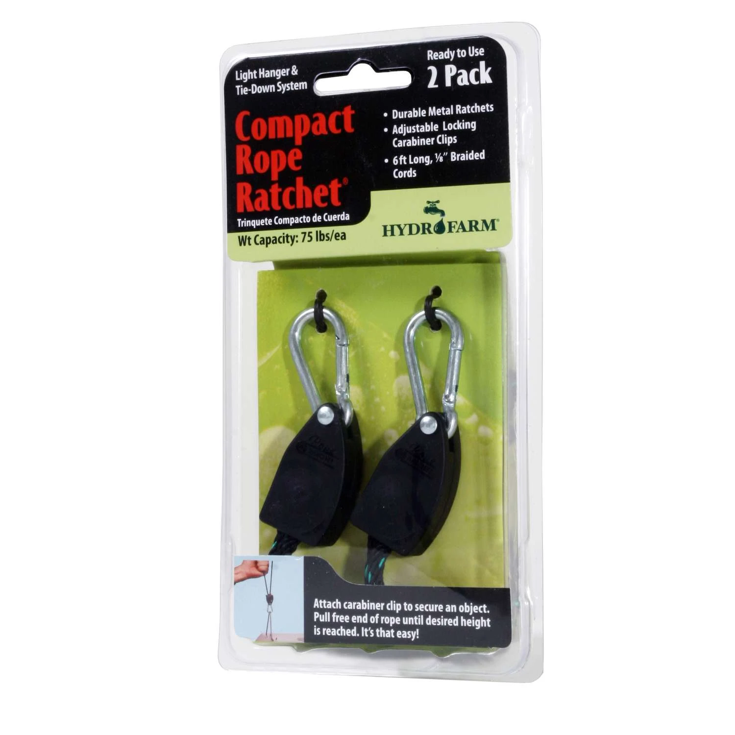 Hydrofarm’s compact rope ratchets are perfect for hanging lights, filters and other equipment. They have metal components for long life and strength and the patented Pulley system pulls tight, locks in place and adjusts easily. Each ratchet holds 75 lbs. so the pair can handle jobs up to 150 lbs. Carabineer clips make attaching or removing equipment a snap. Rope ratchet Ideal for hanging lights, filters and other equipment Adjusts easily Includes four easy to use carabineer clips for attaching or removing equipment, two 6′ cords and 2 ratchets Metal components