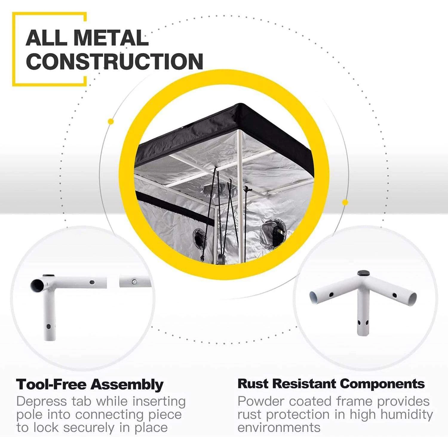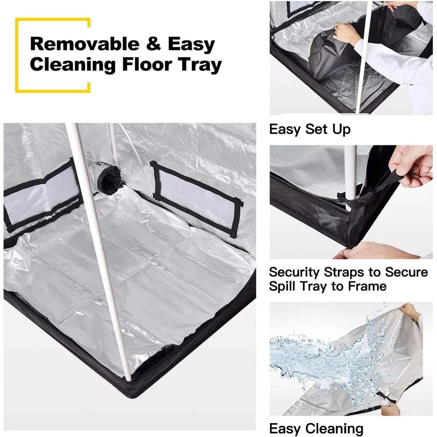 Save Energy: Tear-proof, over 95% reflective, 99% sealed light proof mylar with double stitching and heavy-duty zippers. Sturdy & Reliable: Heavy-duty metal poles rated to handle at least 110 lbs, come with reliable metal corners. Easy view window sealed with transparent plastic and removable cover to get your plant observed without step into your tent Removable water-resistant mylar floor tray with security straps to secure spill tray to frame Remove heat from your plant with double layer ventilation ducting holes and bottom ventilation windows with removable cover Convenient tool bag on hand for most accessory tools