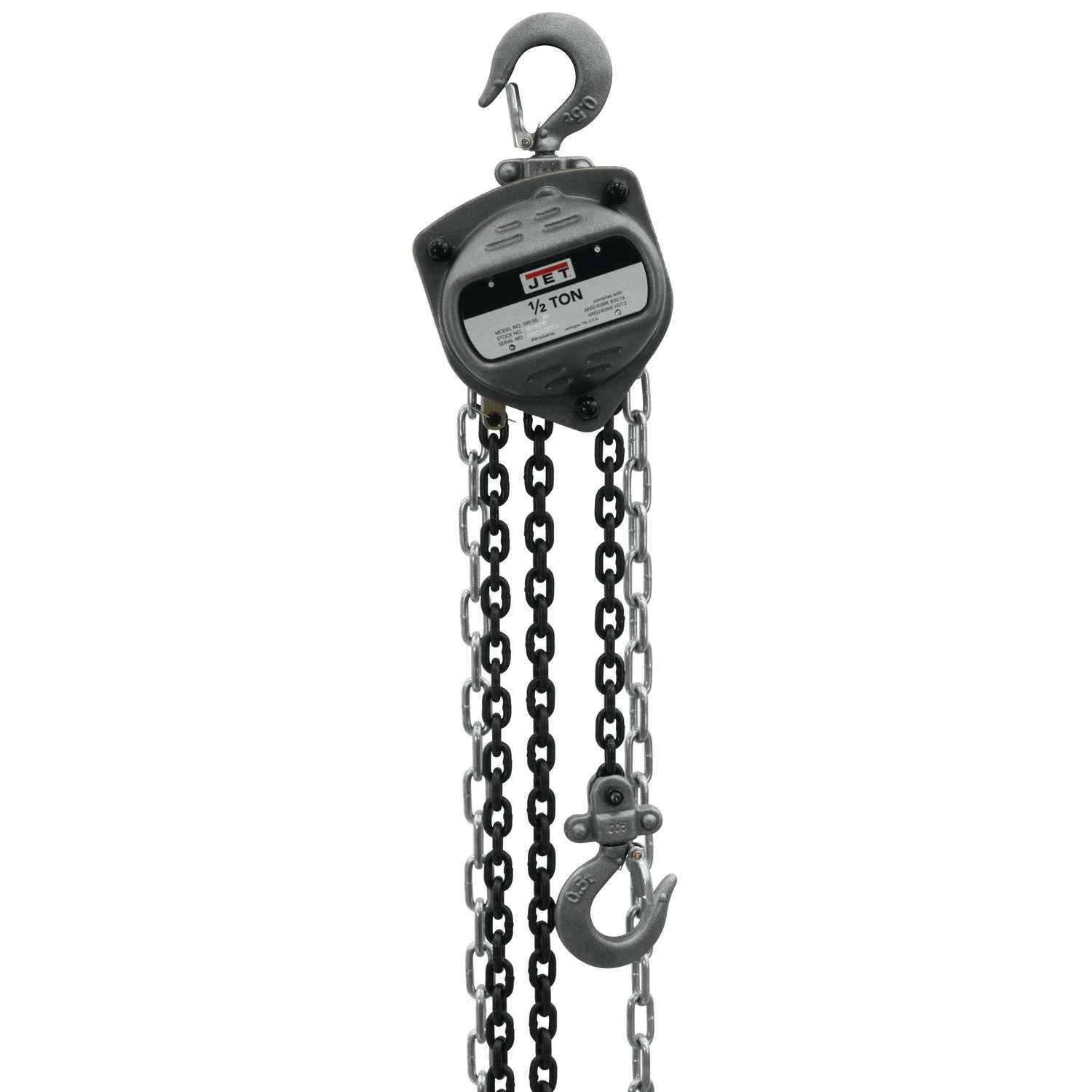 JET S90 series hand chain hoists were designed with reliability and durability to perform in light-duty industrial applications. Easily maintained and serviced, the JET S90 is available in capacities from 1/2 ton to 10 ton and standard lifts of 10, 15, 20 and 30 feet (custom lifts available). The JET S90 is the ideal contractor grade hoist. The smaller body and lightweight design are ideal for confined areas and low headroom applications Impact resistant all steel construction for added durability and protection Needle bearings support the load sheave to increase efficiency and promote smooth operation Intended for the harshest environments, the heat treated load plates and case hardened corrosive resistant internal parts extend the life of the hoist Industrial rated alloy steel hooks rotate 360 degrees for easy rigging and slowly stretch to indicate an overload situation The weston style double ratchet pawl brake design splits the load to opposite sides of the ratchet gear for greater load security and increased safety Grade 80 black oxide coated load chain for added durability Load tested to 125 percent of capacity with certificate Complies with ANSI/ SME B30.16 and HST-2 Standards