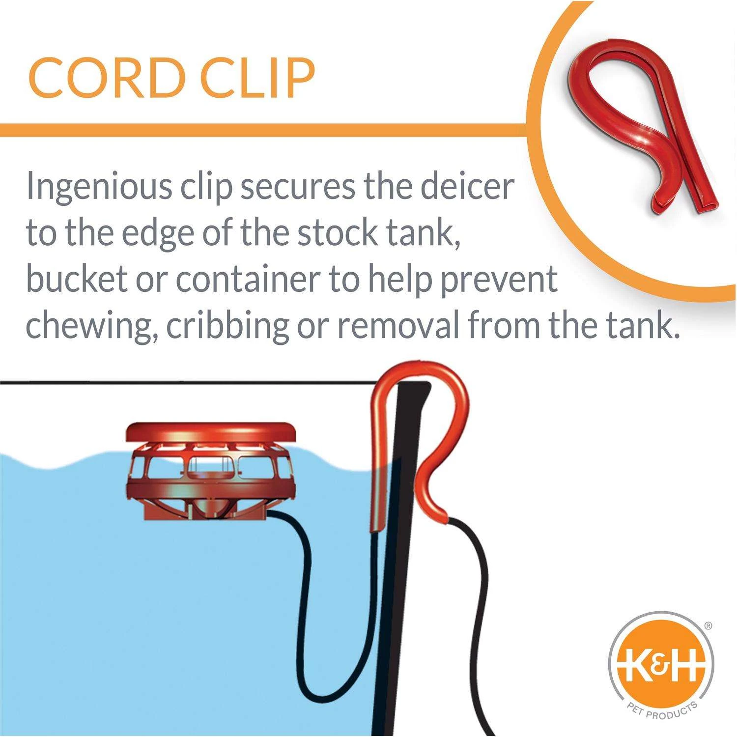 The K&H Ultimate Stock Tank Deicer line from K&H Pet Products has reinvented the wheel when it comes to keeping fresh water available in the winter. Every K&H de-icer is safe in all stock tanks unlike nearly all of the other de-icers available in the market today. No expensive shrouds or cages need be purchased either. Every one of our de-icers can be used as a floating de-icer out of the box or in seconds converts to a submersible de-icer with the click of a button. In the past, all that was readily available were energy gulping 1000 watt to 1500 watt de-icers. Customers had no choice but to purchase these expensive to run de-icers, even when they didn’t need it. We’ve solved this problem by creating a whole line of de-icers along with a convenient zone chart for you to choose the correct de-icer every time. A free cord safety clip is also included with every de-icer. This ingenious clip secures the de-icer to the edge of the stock tank, bucket or container to help prevent chewing, cribbing or removal of the de-icer from the tank. When it comes to fresh water, K&H Ultimate Stock Tank Deicer is the choice that makes cents. Please be sure to review the zone chart to choose the correct de-icer for your application and climate. Bucket deicer, safe for all buckets Thermostatically controlled to automatically respond to temperature changes to keep your bucket from freezing Free cord clip included (keeps power cord away from animals reach) Low wattage and using only 250 watts
