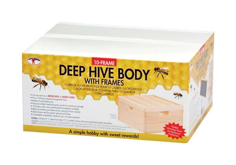 The Little Giant 10 frame deep hive body with frames is pre-assembled for easy setup and use, including pre-installed wax-coated black plastic foundation for easy viewing of hive activity. Made of unfinished pine, the deep hive body can be used as either a brood box or honey super and is precision-milled for maximum strength. Ready to be added to your hive right out of the box. Includes 10-frame 9.5 inch deep hive body, 9.125 inch wooden frames with wax-coated black plastic foundation. Can be used as a brood box or honey super Completely assembled, ready to use and no tools required Precision-milled interlocking box joints for maximum strength Fits a 10-frame standard Langstroth Hive, made of unfinished pine Black foundation provides easier viewing of hive activity