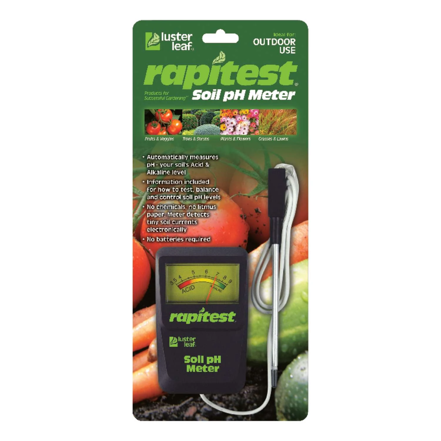 The Luster Leaf Rapitest Soil pH Meter 1840 is specifically designed to tell you instantly how acid or alkaline your soil is with an included plant care brochure listing more than 350 optimum pH levels. The Rapitest Soil pH Meter has the convenience of no litmus paper or chemicals required and is made with tethered stainless steel. This soil meter allows you to modify soil conditions and to confirm which plants will suit your garden. No batteries are needed. Simple readout Automatically measures pH, your soil’s acid and alkaline levels No batteries required Ideal for outdoors or indoors