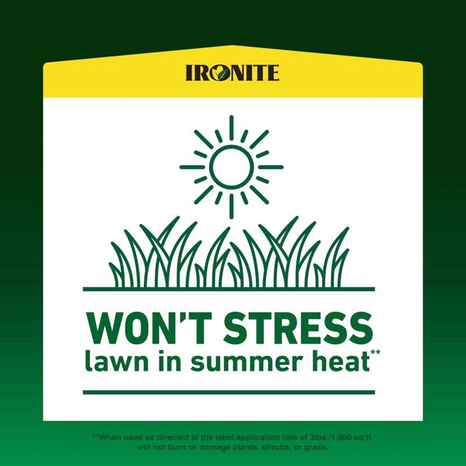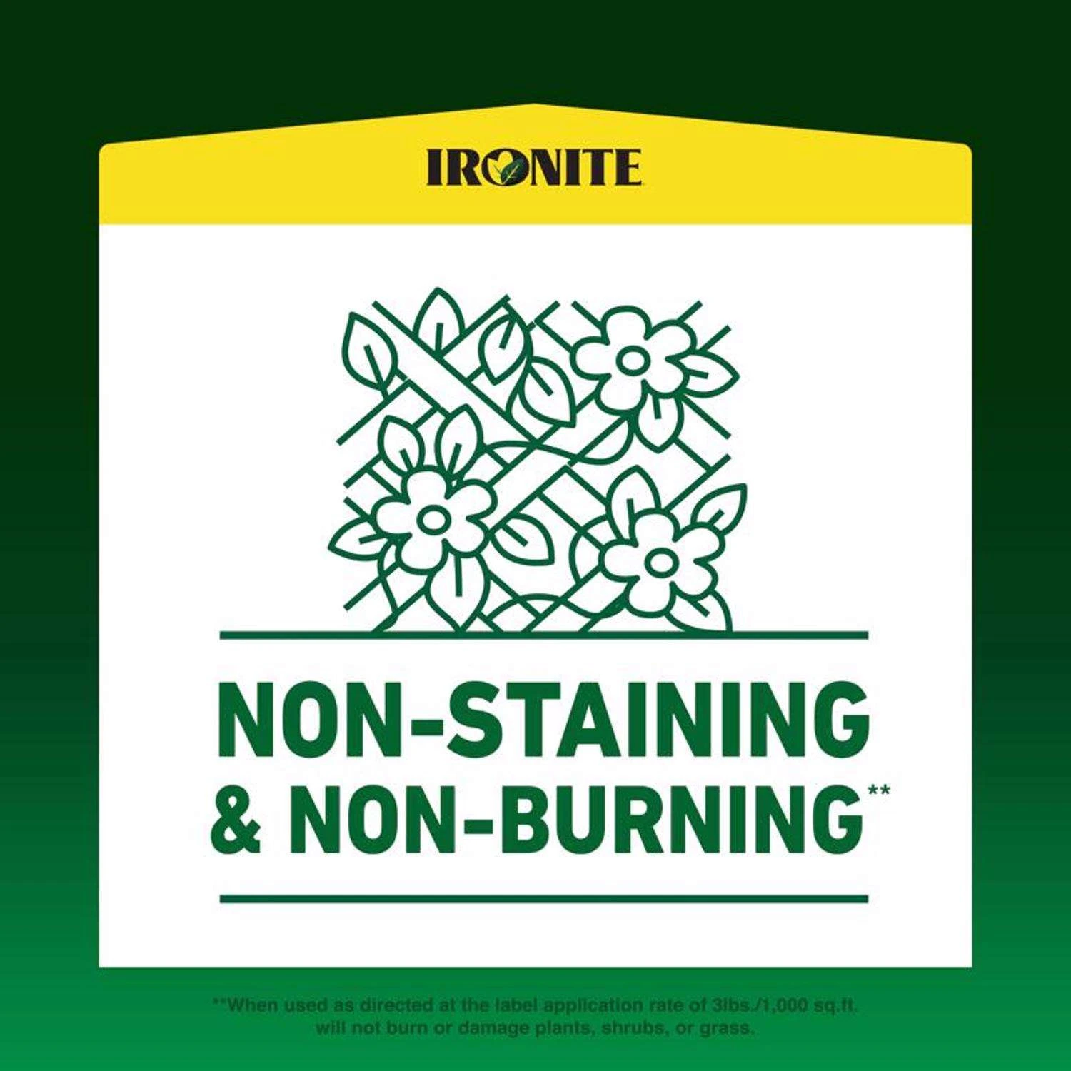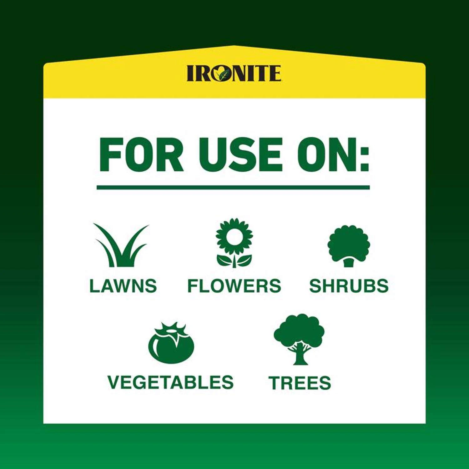 Vibrant, deep green foliage is a sign of a vigorous plant. Pale green or yellow foliage can be caused by nutrient deficiencies which can be corrected by the nitrogen, iron and other minerals found in Ironite Mineral Supplement. Use this product to green up your lawn and garden. When used as directed at the label application rate of 3 lbs / 1,000 sq. ft. will not burn or damage plants, shrubs, or grass. Safely use all through summer to maintain a deep green lawn Helps grass use nutrients found naturally in the soil Creates a deep green lawn with reduced mowing versus regular lawn fertilizers that promote growth Non-staining and non-burning Boost regular spring and fall fertilizer routine Use on lawns, flowers, shrubs, vegetables and trees