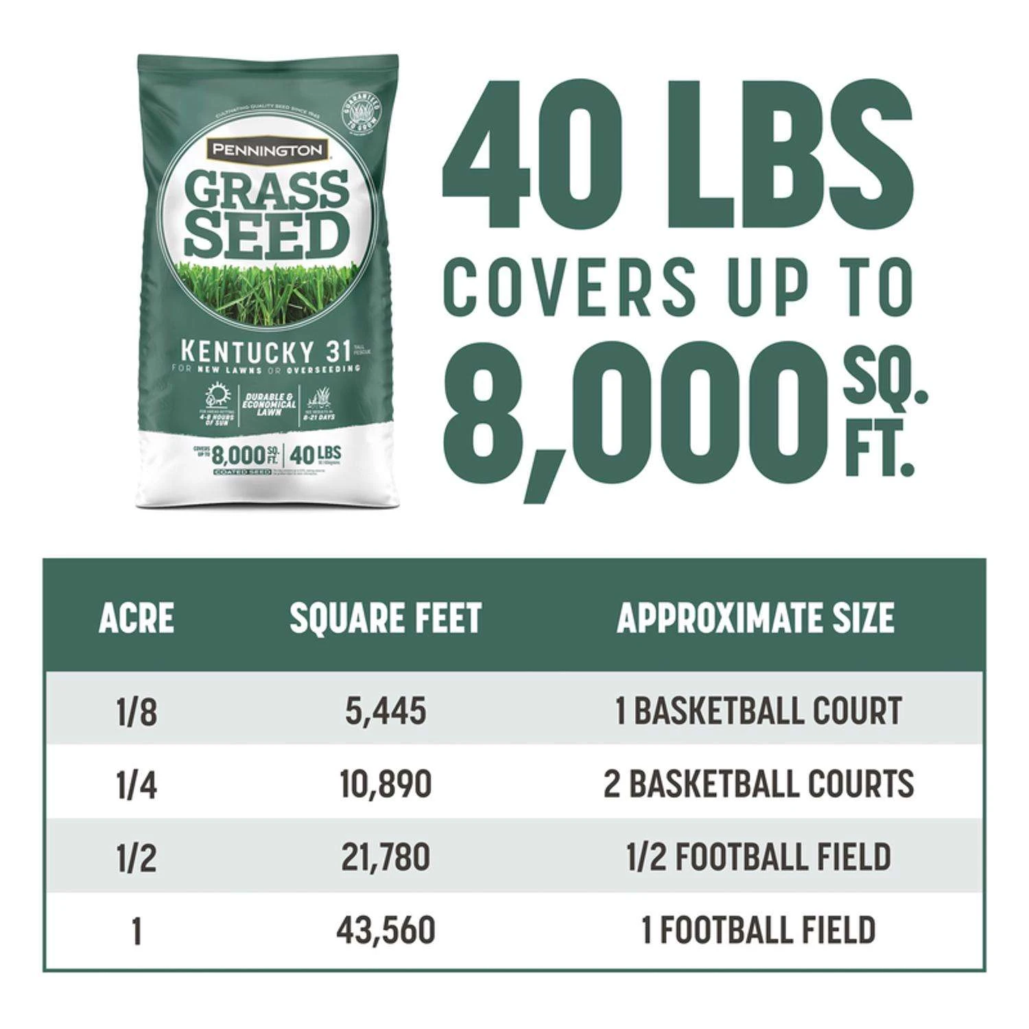 Pennington Kentucky 31 Tall Fescue helped revolutionize the grass seed industry. This durable, heat-tolerant variety was an early leader in putting low-maintenance, disease-resistant lawns within the average homeowner’s reach. Decades later, this economical, traditional tall fescue grass remains an industry standard for cool-season lawn grasses. This tough, drought-resistant grass thrives in lawns that receive 4 to 8 hours of sun. Plant it in the early spring or early fall and start to see results within 8 to 21 days. While most grass seed companies buy their seed on the open market, we are the only major grass seed company that works directly with a network of dedicated growers. Built on decades of trust and integrity, our relationships with seed growers and their families now span multiple generations. Our legacy of working directly with farmers to bring you the finest grass seed possible helps ensure their success and ours. At Pennington, we know our seed and the farmers who grow it. From field to final product, that’s the Pennington way. 4-8 hours of sun needed For use in full sun to medium-shaded areas Durable, economical grass seed Produces a lighter green, drought-resistant turf Holds up well under foot traffic Penkoted for seedling protection Proprietary seed treatment promotes growth Not recommended for use in warm season lawns Penkoted technology protects the seed from deadly fungus during the early growth period when grass is most susceptible to disease Keep the soil moist water daily (twice a day if you have to) until grass sprouts and reaches about 3 in. tall
