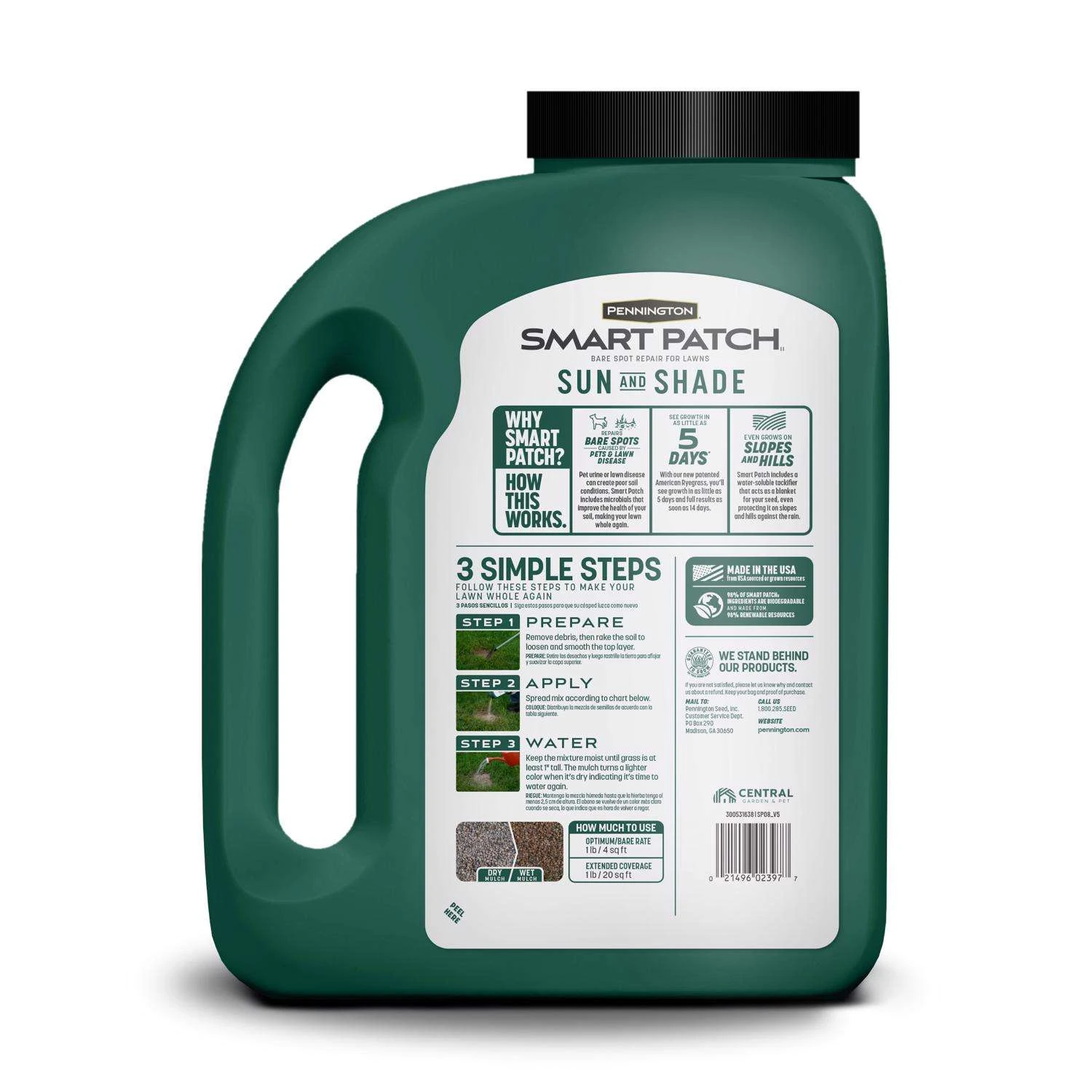 Pennington Smart Patch, you don’t need to know why your lawn has thin, bare or brown spots. Smart Patch eliminates the guesswork and frustration of lawn repairs. This product has everything you need to fix bare spots, neutralize soil and disease problems and grow thick, lush, water-conserving grass – even on slopes and hills. Pet damage and urine spots, No problem. Lawn disease and poor soil conditions, That’s covered, too. With Smart Patch, you’ll see quick results you can rely on. It’s the smart choice for lawn repairs. Seedling emergence in as little as 5 days Contains a tackifier to protect seed on slopes, hills and rain Contains microbials that prevent disease and improve overall health of lawn
