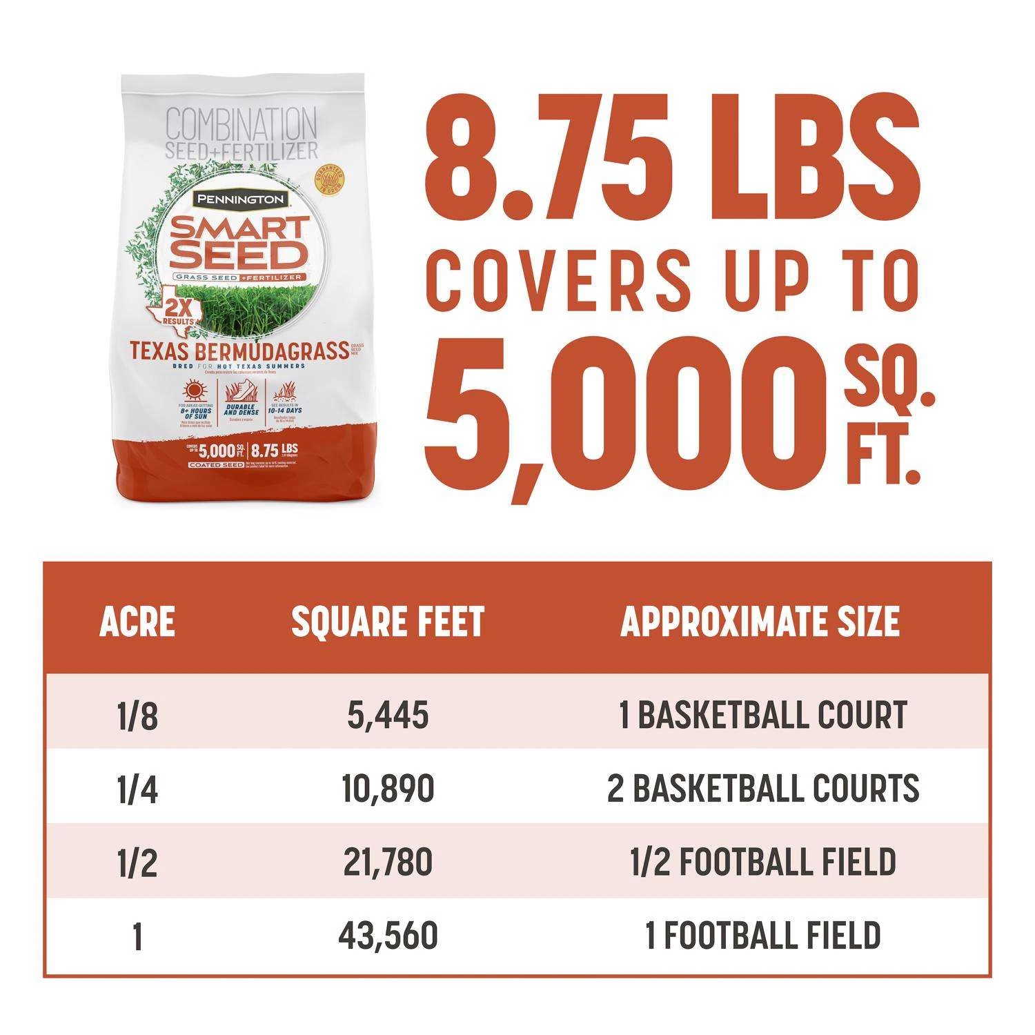 Bermudagrass is ideal for Texas lawns that bask in full sun for eight or more hours each day. Pennington Smart Seed Texas Bermudagrass. Plant it in spring or early summer and see results in 10 to 14 days. This 8.75-pound bag covers up to 5,000 square feet for overseeding an existing lawn and 2,500 square feet for starting a new lawn from scratch. Growing a lawn from ordinary Bermudagrass seed can require a lot of patience. At Pennington, we understand you want beauty and results without the wait. Thanks to innovation and seed technology, Pennington Smart Seed Bermudagrass + Fertilizer will give you twice the results and coverage compared to Bermudagrass alone. The Smart Seed mix includes a temporary, cool-season companion grass that provides stability to the soil and early color, then fades away as the heat arrives. You also get earlier germination and faster establishment compared to Bermudagrass alone. Bermudagrass grass seed mix for sunny lawns in Texas Contains just the right amount of fertilizer to help your lawn succeed Formulated mix that helps Bermuda lawns start strong and crowd out weeds Offers fast establishment and strong coverage for 2x results Exceptional heat, drought and traffic tolerance