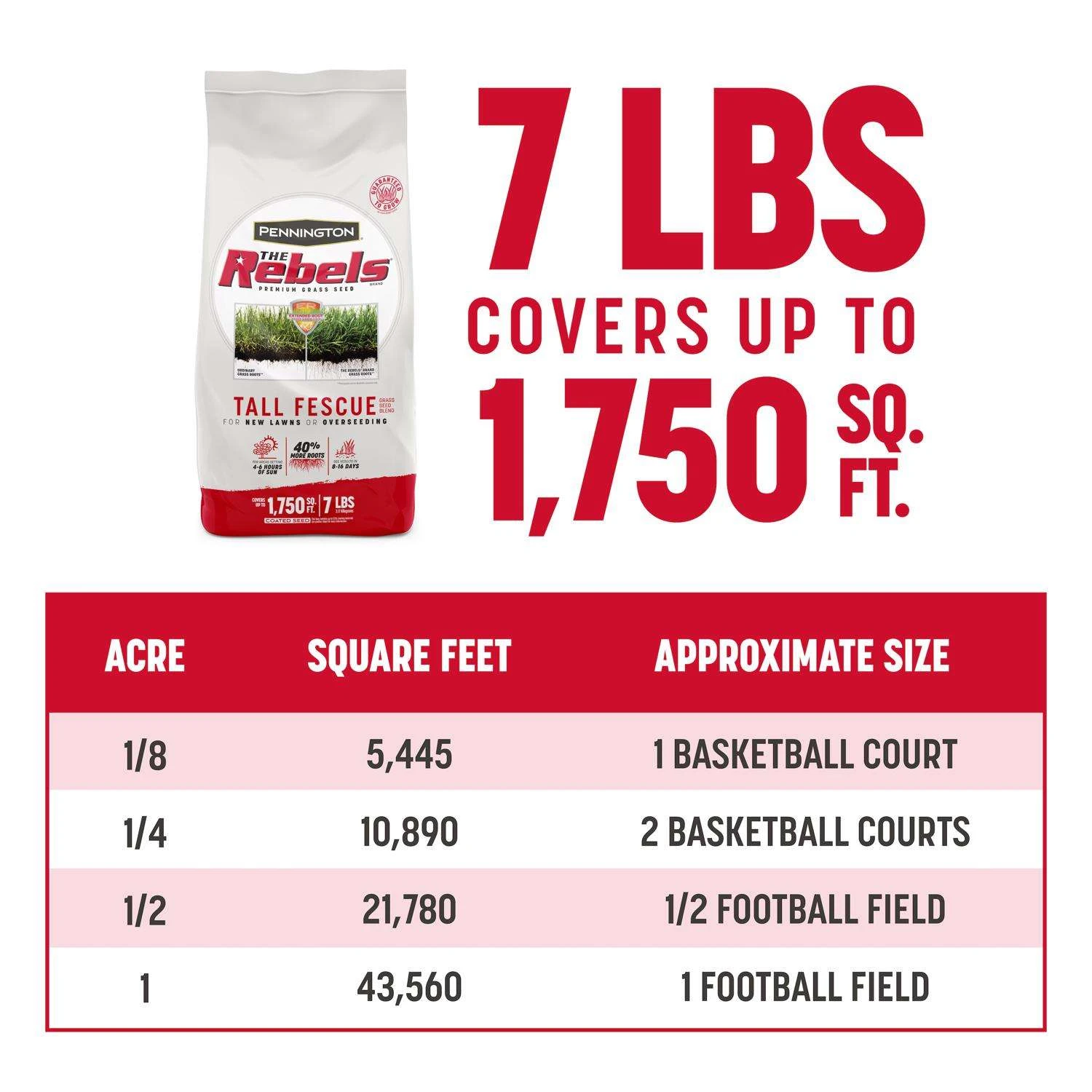 Tall fescue is valued for its adaptability to a wide range of climates and its tolerances for cold, heat, drought, and shade. Ideal for the northern and transition zones, Pennington The Rebels Tall Fescue has represented the finest quality of tall fescue on the market for decades. A 3-pound bag covers up to 750 square feet for overseeding an existing lawn and 250 square feet for starting a new lawn from scratch. The Roots of the Rebels Brand dates back to 1979 when turf researchers at Rutgers University released a revolutionary new grass. Known as ‘Rebel,’ it was the very first example of what’s now known as turf-type tall fescue. The Rebels Brand Extended Root seed varieties represent the best turf-type tall fescue on the market. With roots like those, it’s only natural that The Rebels Brand carries the Pennington name. In areas of your yard that receive 4 to 6 hours of sunlight, plant it in early spring or early fall and see results in 8 to 16 days Compared to traditional tall fescue, Rebel offered lower growth, finer texture, darker color, and denser turf plus the drought tolerance that makes turf-type tall fescue a homeowner favorite Generations later, with up to 40 percent more roots than ordinary grass
