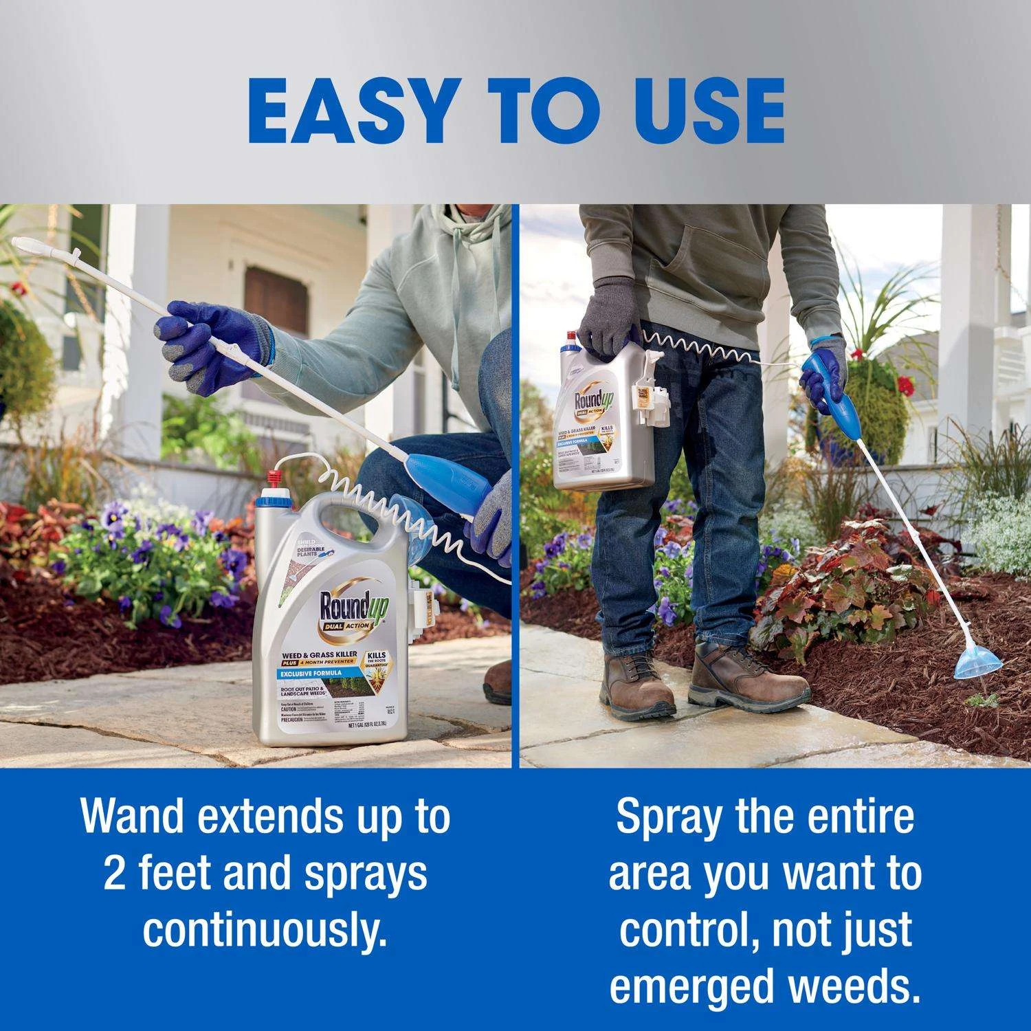 Root out the toughest weeds and grasses with Roundup Dual Action Weed & Grass Killer Plus 4 Month Preventer with Sure Shot Wand. This formula kills existing weeds and grass down to the root, and prevents new weeds from growing for up to 4 months by creating an invisible barrier in the soil. Apply only where you want to kill existing weeds AND prevent future weed growth for up to 4 months, such as cracks and crevices in driveways, sidewalks, and patios, along fences, in mulched beds or around the base of well-established desirable plants, shrubs, or trees, and on gravel areas. In order to prevent new weeds and grasses from growing, you must spray the entire area you want to control, not just the emerged weeds. For best results, apply during warm, sunny weather above 60 F. Rain or watering 30 minutes after application will NOT wash away effectiveness. After application, weeds will begin to yellow and wilt within hours with complete kill in 1 to 2 weeks. All ornamental bedding plants (annuals and perennials), trees, shrubs, sod and seed can be planted 4 months after application. Roundup Dual Action covers up to 300 sq. ft. Roundup Dual Action Weed & Grass Killer Plus 4 Month Preventer with Sure Shot Wand kills existing weeds and grass down to the root and prevents new weeds from growing for up to 4 months This weed killer and preventer is rainproof in as fast as 30 minutes, and produces visible results in as fast as 6 hours Apply this herbicide to hardscapes and landscapes – cracks and crevices in driveways, sidewalks, and patios, along fences, in mulched beds or around the base of well-established desirable plants, shrubs, or trees, and on gravel areas All ornamental bedding plants, trees, shrubs, sod, and seed can be planted 4 months after application The innovative protective shield of the Sure Shot Wand allows you to use Roundup Dual Action with confidence to target weeds in garden beds and landscaped areas