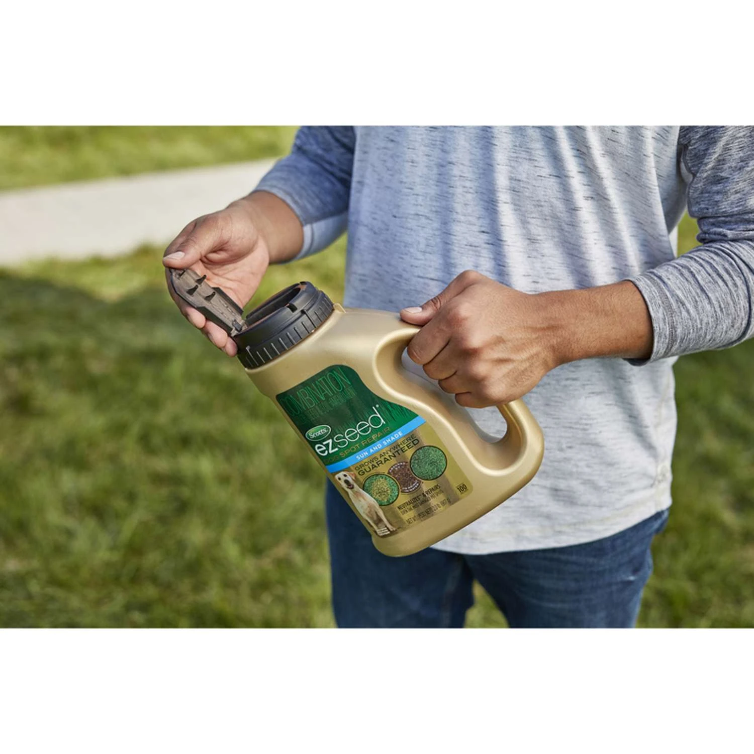 Scotts EZ Seed Dog Spot Repair has a special salt neutralizer formula that minimizes the effects of salts from dog urine and repairs up to 100 dog spots in your lawn. Dog Spot Repair Sun and Shade consists of a combination of high performance grass seed, mulch that expands to surround the seed, a soil amendment that repairs areas burned by dog urine, tackifier to help keep seeds from washing away and a protectant to help keep seeds safe. There are three easy steps to success: 1) prep the area by removing dead grass and loosening hard soil, 2) evenly apply EZ Seed so the area is mostly covered but bare ground is still visible, and 3) saturate with water until no more water is being absorbed and seed turns dark brown. When EZ Seed begins to turn light brown, it’s time to water again. Plant seed in the spring or fall when daily average soil temperatures are consistently between 55 F and 70 F, or air temperatures between 60 F and 80 F. For best results, keep kids, pets, and lawn mowers off newly planted seedlings until the grass is 3 inches high. Scotts EZ Seed Dog Spot Repair Sun and Shade has a special salt neutralizer formula that minimizes the effects of salts from dog urine and repairs damage Consists of a combination of high performance grass seed, mulch that expands to surround the seed, a soil amendment that helps repair areas burned by dog urine, tackifier to help keep seeds from washing away and a protectant to help keep seed safe Dog Spot Repair is ideal for urine spots, high traffic areas and damage from digging Plant seed in the spring or fall when daily average soil temperatures are consistently between 55 F and 70 F, or air temperatures between 60 F and 80 F EZ Seed Dog Spot Repair repairs up to 100 spots of lawn damage caused by pets in 3 easy steps