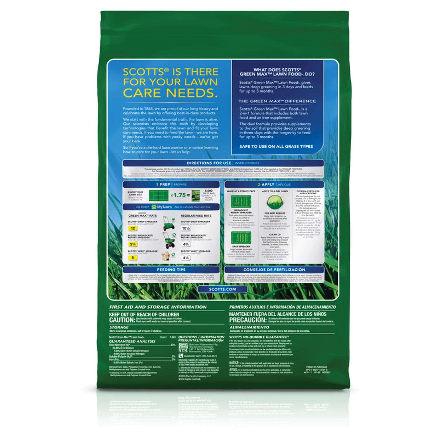 Get a deeper-green lawn in just 3 days! With its innovative 2-in-1 formula, Scotts Green Max Lawn FoodFL fertilizes your grass and provides it with an additional iron supplement to give your yard a deeper green in 3 days. Apply using a Scotts broadcast, rotary, drop, or Wizz spreader to up to 5,000 sq. ft. of lawn. Safe to use on any grass type, Green Max Lawn FoodFL feeds for up to 3 months. Scotts Green Max Lawn FoodFL is a 2-in-1 formula: fertilizer and iron supplement Apply to any grass type, and see deep greening in 3 days Fertilizes lawns for up to 3 months Apply using a Scotts broadcast, rotary, drop, or Wizz spreader Covers up to 5,000 sq. ft.