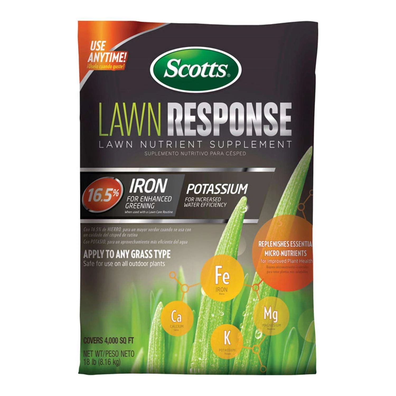 Give your lawn the essential nutrients it needs with Scotts Lawn Response Lawn Nutrient Supplement. With potassium and 16.5% iron, this Lawn Nutrient Supplement replenishes micronutrients to your lawn for improved plant health. You can use on all grass types and outdoor plants. Let Scotts Lawn Response Lawn Nutrient Supplement help make your lawn greener. Replenishes essential micronutrients for improved plant health Contains 16.5% iron for enhanced greening Includes potassium for increased water efficiency Use anytime even during florida fertilizer restriction Safe for all grass types and outdoor plants