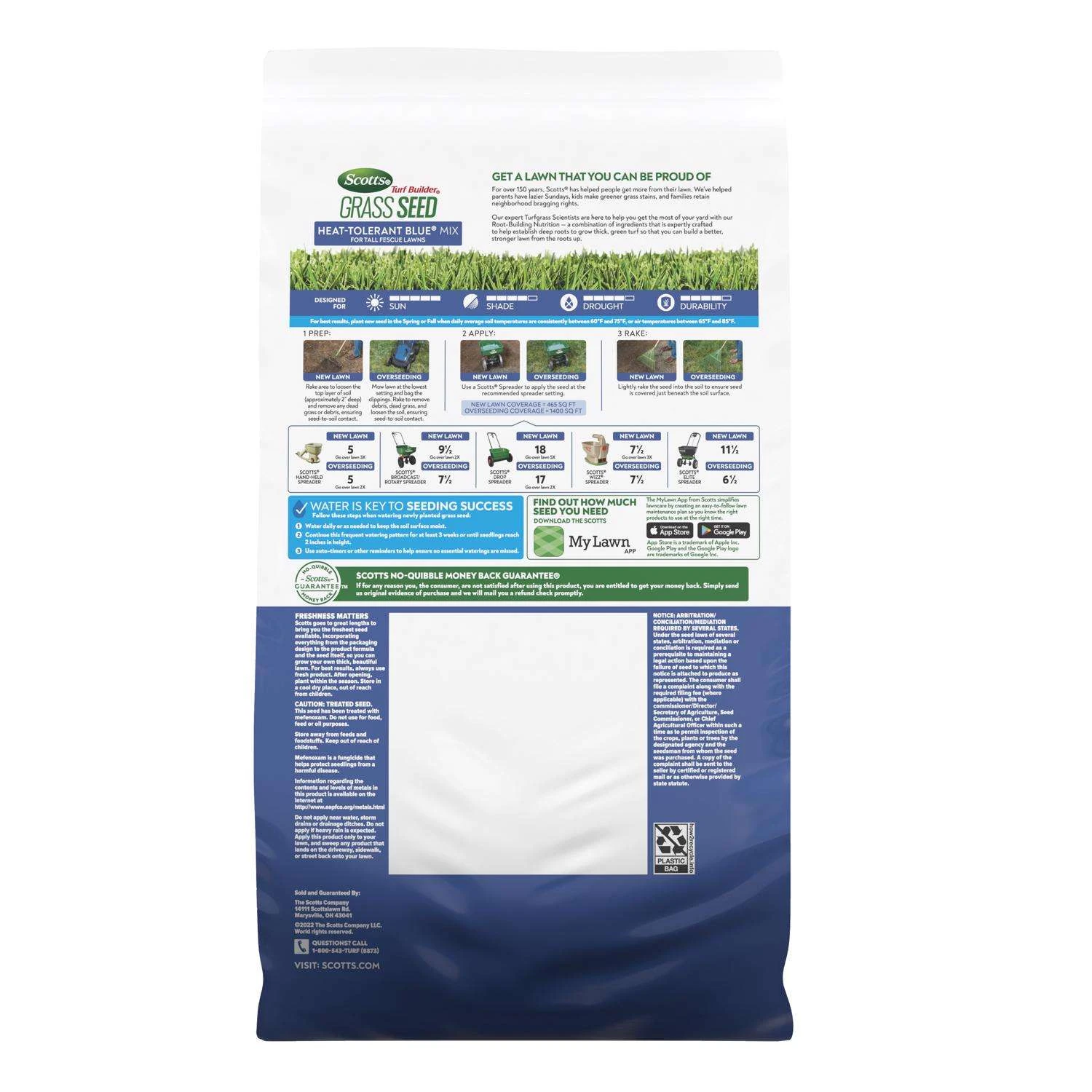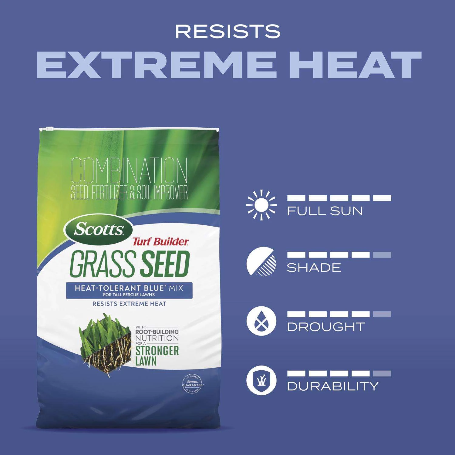 Scotts Turf Builder Grass Seed Heat-Tolerant Blue Mix for Tall Fescue Lawns resists extreme heat. This mix contains Root-Building Nutrition, a combination of ingredients that is expertly crafted to help establish deep roots to grow thick, green turf so that you can build a better, stronger lawn from the roots up. Scotts Turf Builder Grass Seed Heat-Tolerant Blue Mix for Tall Fescue Lawns is designed for full sun and partial shade, and has medium to high drought resistance with medium to high durability. It can be used to seed a new lawn or overseed an existing lawn. For best results, apply in the spring or fall when daily average soil temperatures are consistently between 60 F and 75 F or air temperatures are between 65 F and 85 F. We recommend using a Scotts spreader to apply this product (please refer to spreader settings on product label). Water daily or as needed to keep the soil surface moist until the seedlings reach at least 2 inches tall. One 5.6 lb. bag of Scotts Turf Builder Grass Seed Heat-Tolerant Blue Mix for Tall Fescue Lawns has a new lawn coverage of 465 sq. ft. and an overseeding coverage of 1,400 sq. ft. The redesigned Scotts Turf Builder Grass Seed Heat-Tolerant Blue Mix for Tall Fescue Lawns resists extreme heat and features Root-Building Nutrition for a stronger lawn This grass seed mix is designed for full sun and partial shade, and has medium to high drought resistance with medium to high durability Use this lawn care product in the spring or fall to seed a new lawn or overseed an existing lawn Our Root-Building Nutrition formula combines seed, fertilizer, and soil improver to help establish deep roots, allowing you to build a strong, green lawn One 5.6 lb. bag of Scotts Turf Builder Grass Seed Heat-Tolerant Blue Mix for Tall Fescue Lawns has a new lawn coverage of 465 sq. ft. and an overseeding coverage of 1,400 sq. ft.