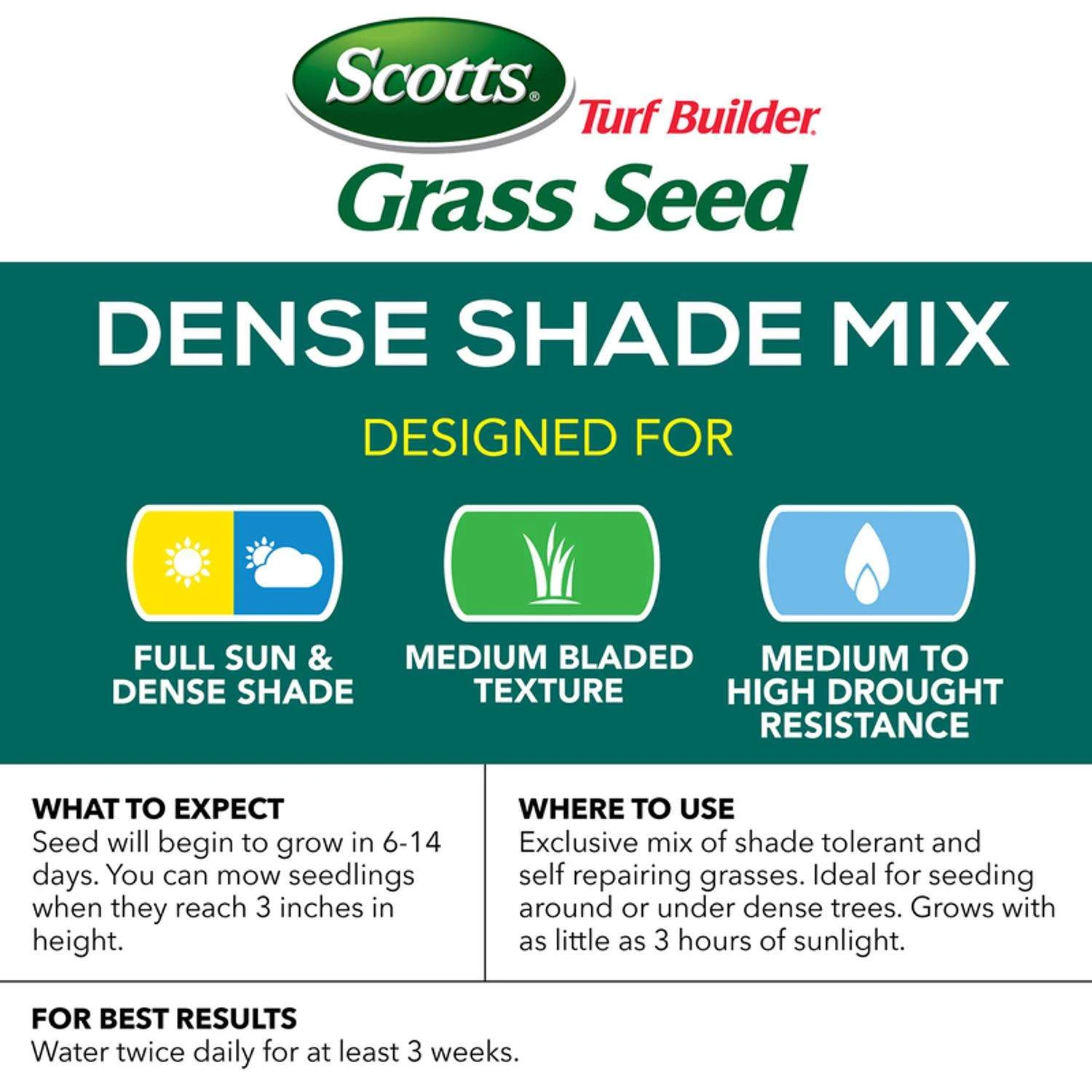 Scotts Turf Builder Grass Seed Dense Shade Mix is an exclusive mix of shade-tolerant and self-repairing grasses. This mix is ideal for seeding around or under areas of dense trees and it grows with as little as 3 hours of sunlight. Each seed is wrapped in a unique 4 in 1 WaterSmart Plus Coating that absorbs 2x more water than uncoated seed, feeds with essential nutrients and helps protect seedlings from disease. Germination time for 6 – 30 days Grows quicker, thicker, greener grass guaranteed Medium bladed texture with medium to high drought tolerance