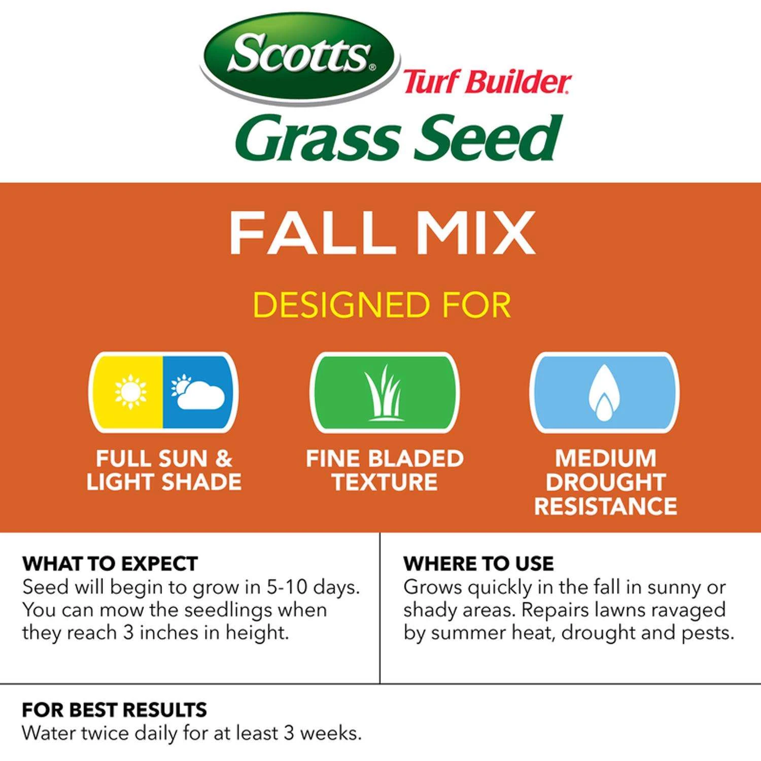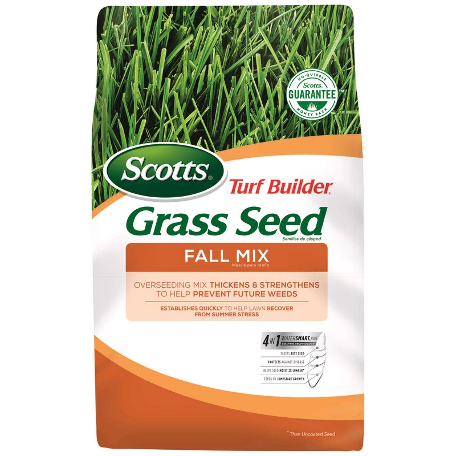 Scotts Turf Builder Grass Seed Fall Mix is an overseeding mix that thickens and strengthens to help prevent future weeds, and establishes quickly to help your lawn recover from summer stress. In addition, each seed is wrapped in a unique 4-in-1 WaterSmart PLUS Coating to keep seed moist 2X longer than uncoated seed, feed to jumpstart growth, and protect against disease. Scotts Turf Builder Grass Seed Fall Mix is designed for full sun and light shade, and has a fine bladed texture with medium drought resistance. It can be used to overseed an existing lawn. For best results, apply in the fall when air temperatures are consistently between 60F and 80F. We recommend using a Scotts spreader to apply this product (please refer to spreader settings on product label). Water daily or as needed to keep the soil surface moist until the seedlings reach at least 2 inches tall. One 3 lb. bag of Scotts Turf Builder Grass Seed Fall Mix has a new lawn coverage of 400 sq. ft. and an overseeding coverage of 1,200 sq. ft. Scotts Turf Builder Grass Seed Fall Mix is an overseeding mix that thickens and strengthens to help prevent future weeds, and establishes quickly to help your lawn recover from summer stress This grass seed mix is designed for full sun and light shade, and has a fine bladed texture with medium drought resistance Use this lawn care product in the fall to overseed an existing lawn Each seed is wrapped in a unique 4-in-1 WaterSmart PLUS Coating to keep seed moist 2X longer than uncoated seed, feed to jumpstart growth, and protect against disease One 3 lb. bag of Scotts Turf Builder Grass Seed Fall Mix has a new lawn coverage of 400 sq. ft. and an overseeding coverage of 1,200 sq. ft.