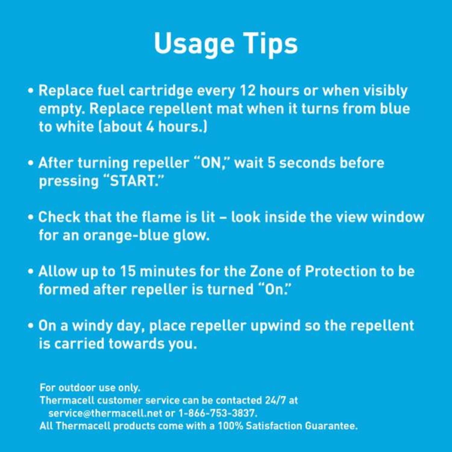 | What's Included | INCLUDES: Ten 12-hour fuel cartridge, and thirty 4-hour repellent mats |